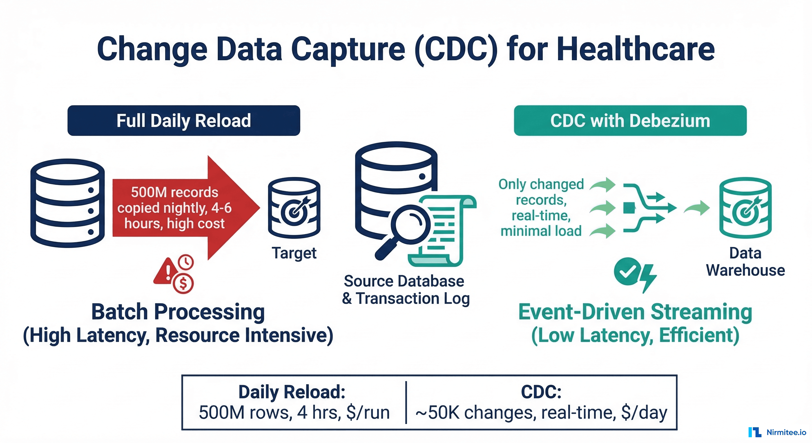 Change Data Capture (CDC) eliminates this waste by capturing only the rows that actually changed since the last sync. Instead of copying 500 million records, you process only the 50,000 that were inserted, updated, or deleted. The result: near-real-time data freshness, 95% lower compute costs, and minimal load on the source EHR database. This guide covers both database-level CDC with Debezium and application-level CDC with FHIR Subscriptions, with production code for each approach.