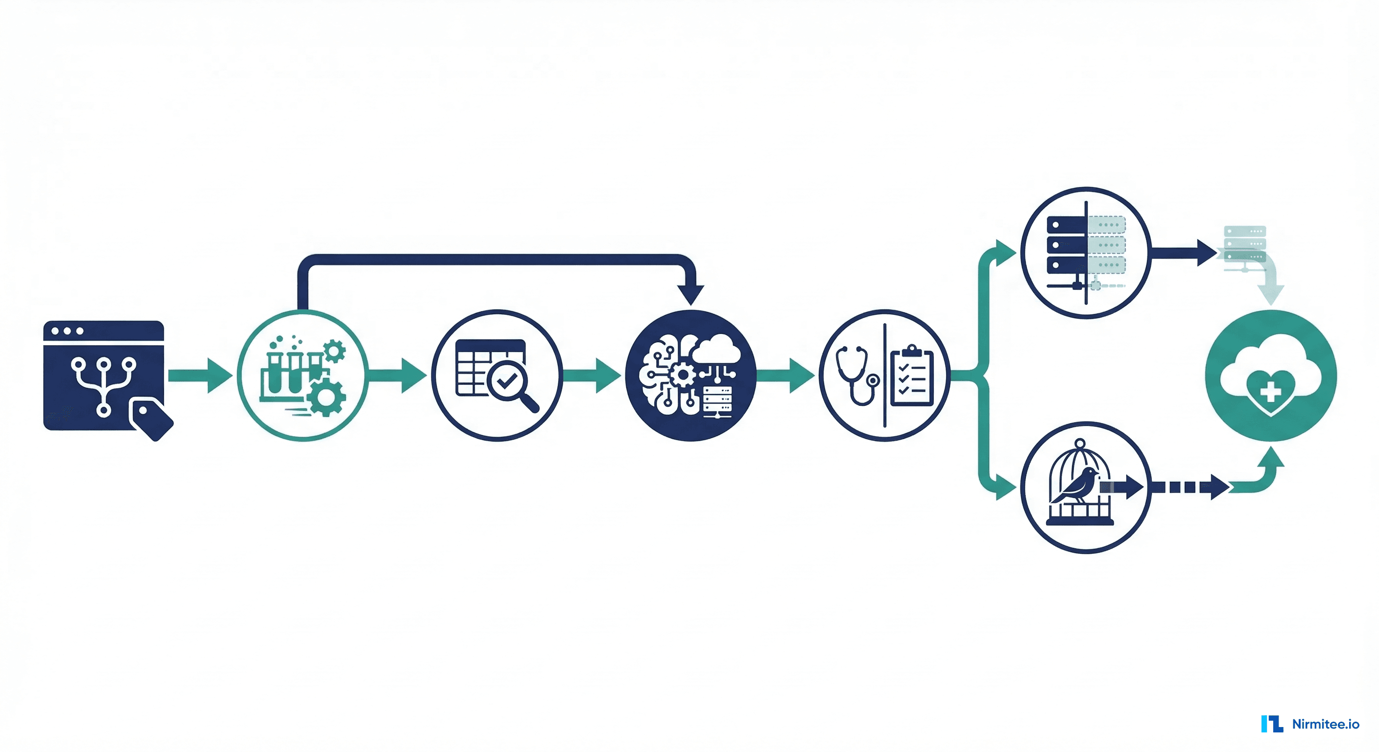 A production healthcare ML pipeline has nine distinct stages, each with specific gates that must pass before proceeding to the next. Unlike standard software deployment where a green test suite means "ship it," healthcare ML requires multiple independent validation layers, including one that requires a human clinician to review and approve.