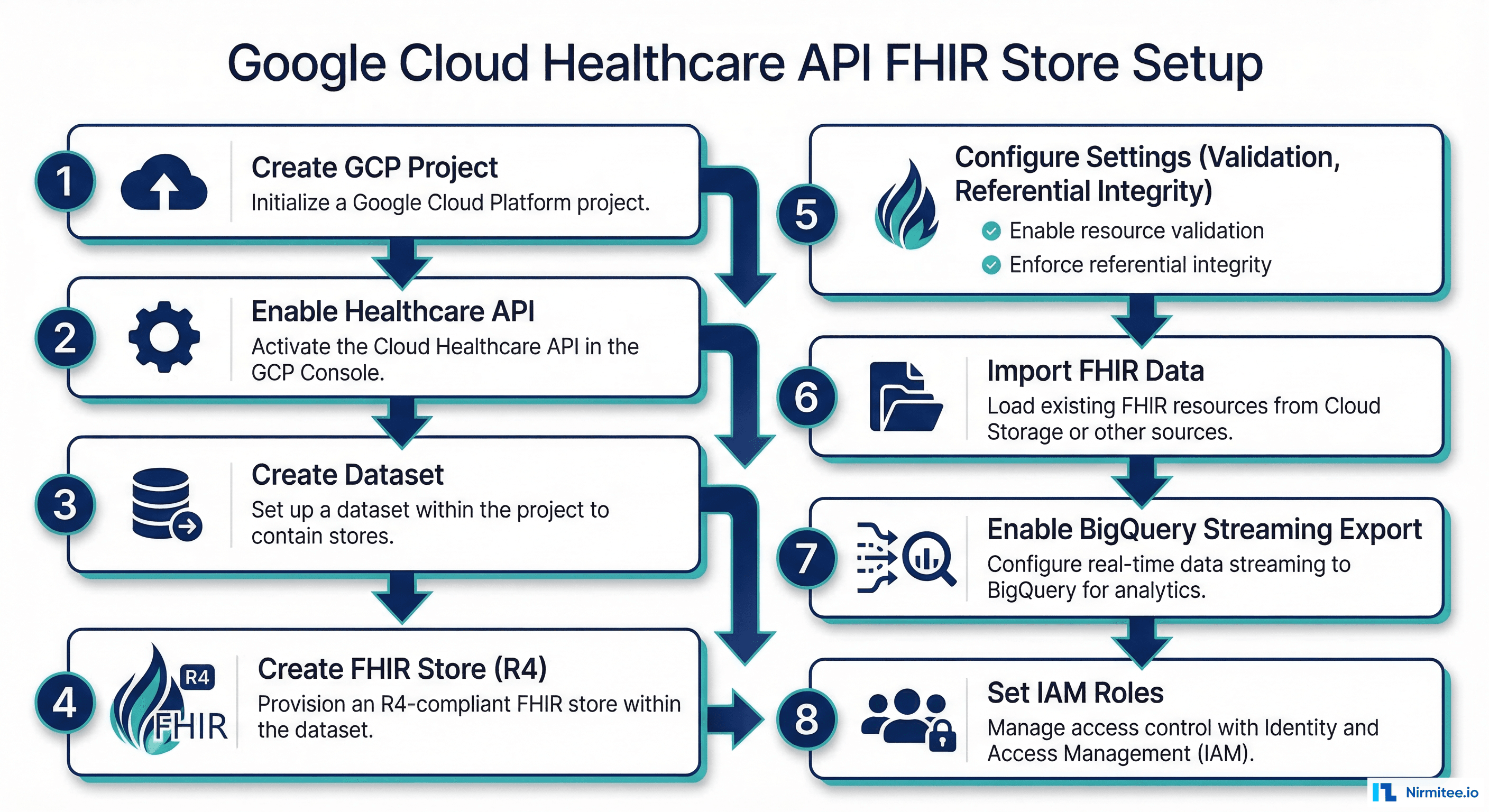 This guide walks through every step of creating a production FHIR store: from GCP project setup through data import, BigQuery streaming export, de-identification configuration, and IAM roles. Every command is included so you can follow along and have a working FHIR store in under an hour.