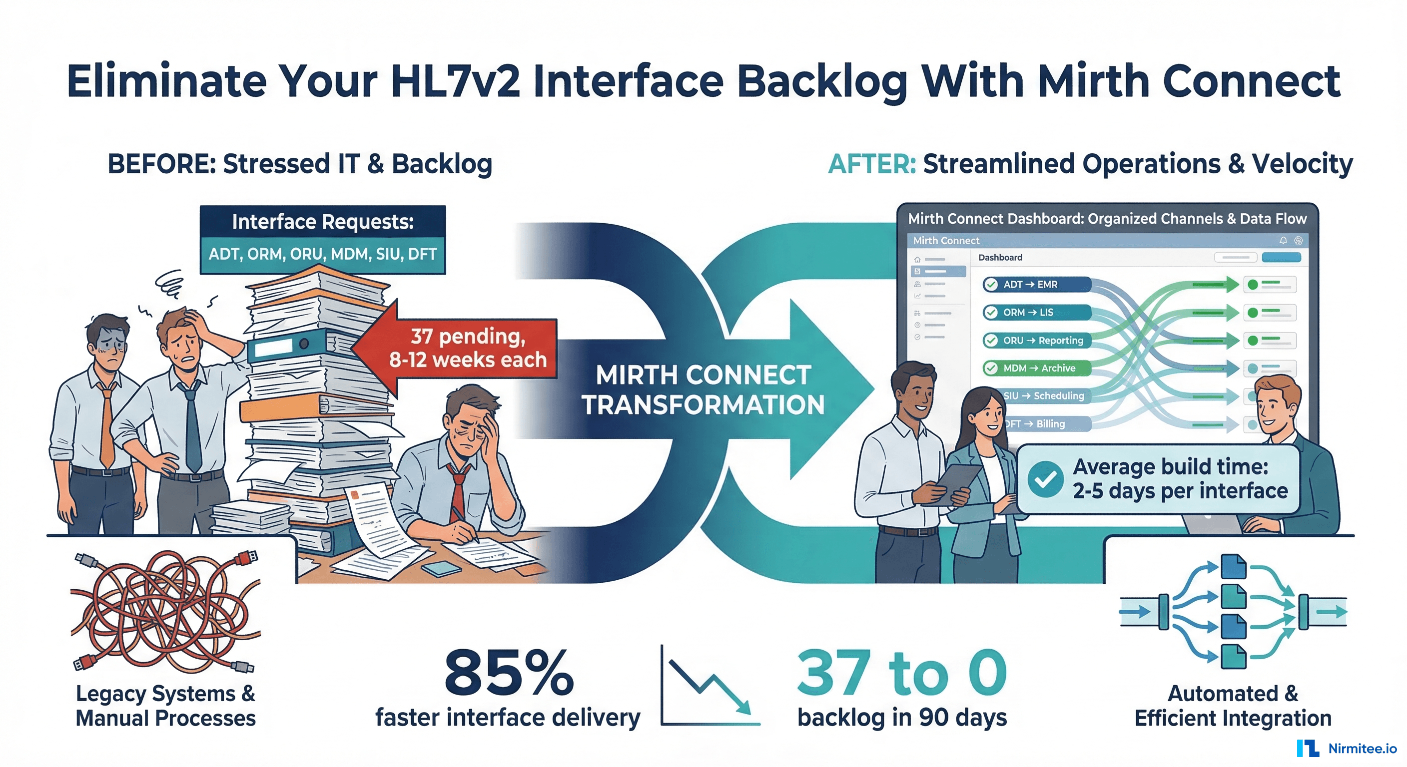 An experienced Mirth engineer can build a standard interface (ADT, ORM, ORU) in 4-8 hours using templates. Complex interfaces with custom business logic (DFT with charge calculation, MDM with document formatting) take 2-3 days. At this rate, a team of 2 engineers can deliver 5-10 interfaces per week, clearing a 37-interface backlog in under 8 weeks.