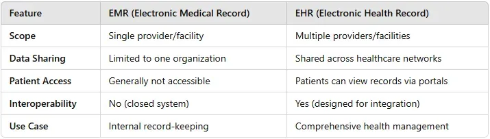 - EMR: Limited to one healthcare provider or practice. It contains data about the treatment and care provided by that specific provider.