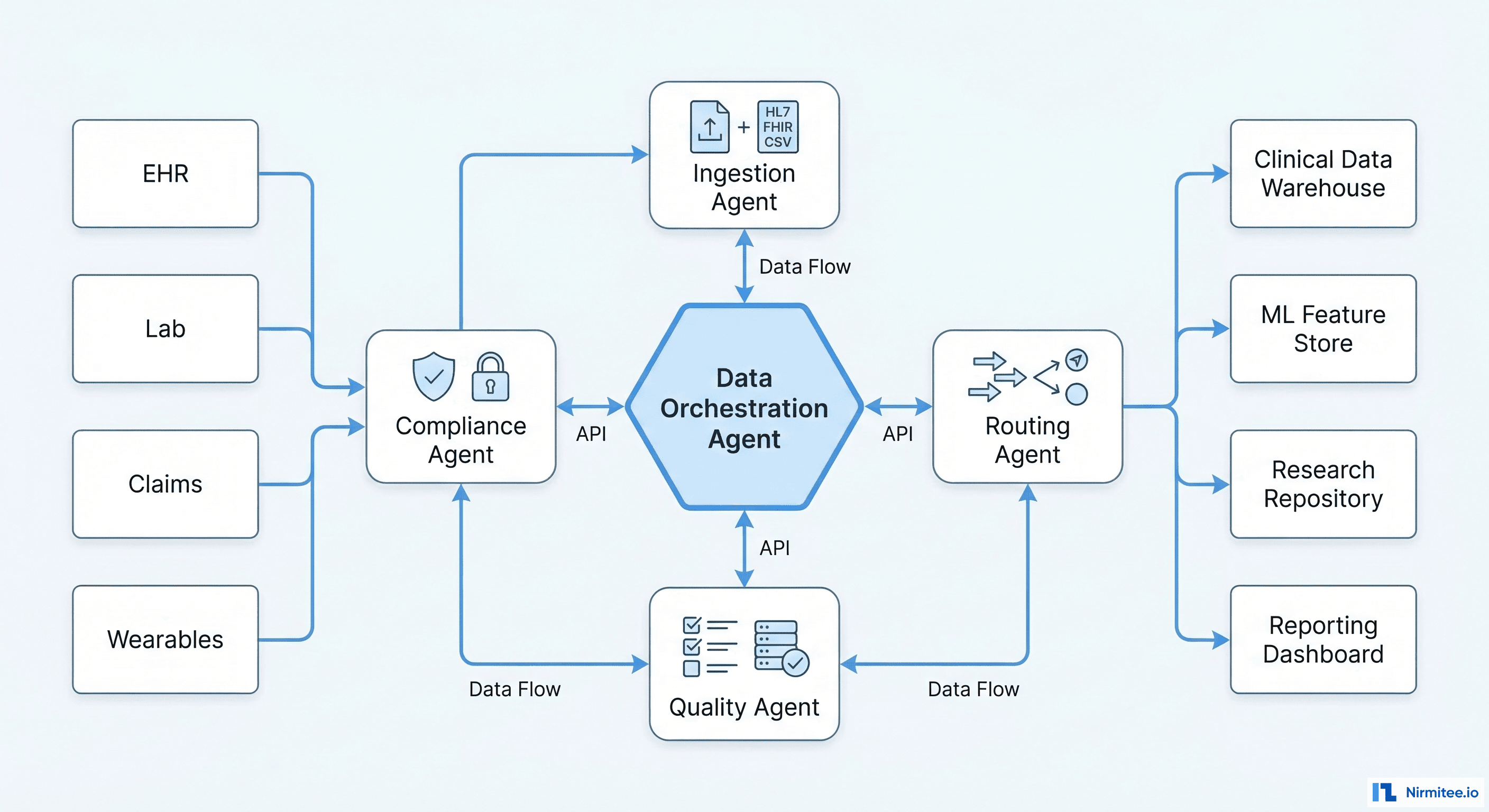 Determines where data should go based on its content and the organizational data architecture. Clinical results go to the EHR and the clinical data warehouse. Claims data goes to the revenue cycle system. Research-eligible data (after de-identification) goes to the research repository. The Routing Agent maintains a dynamic routing table that adapts as new data consumers are added.