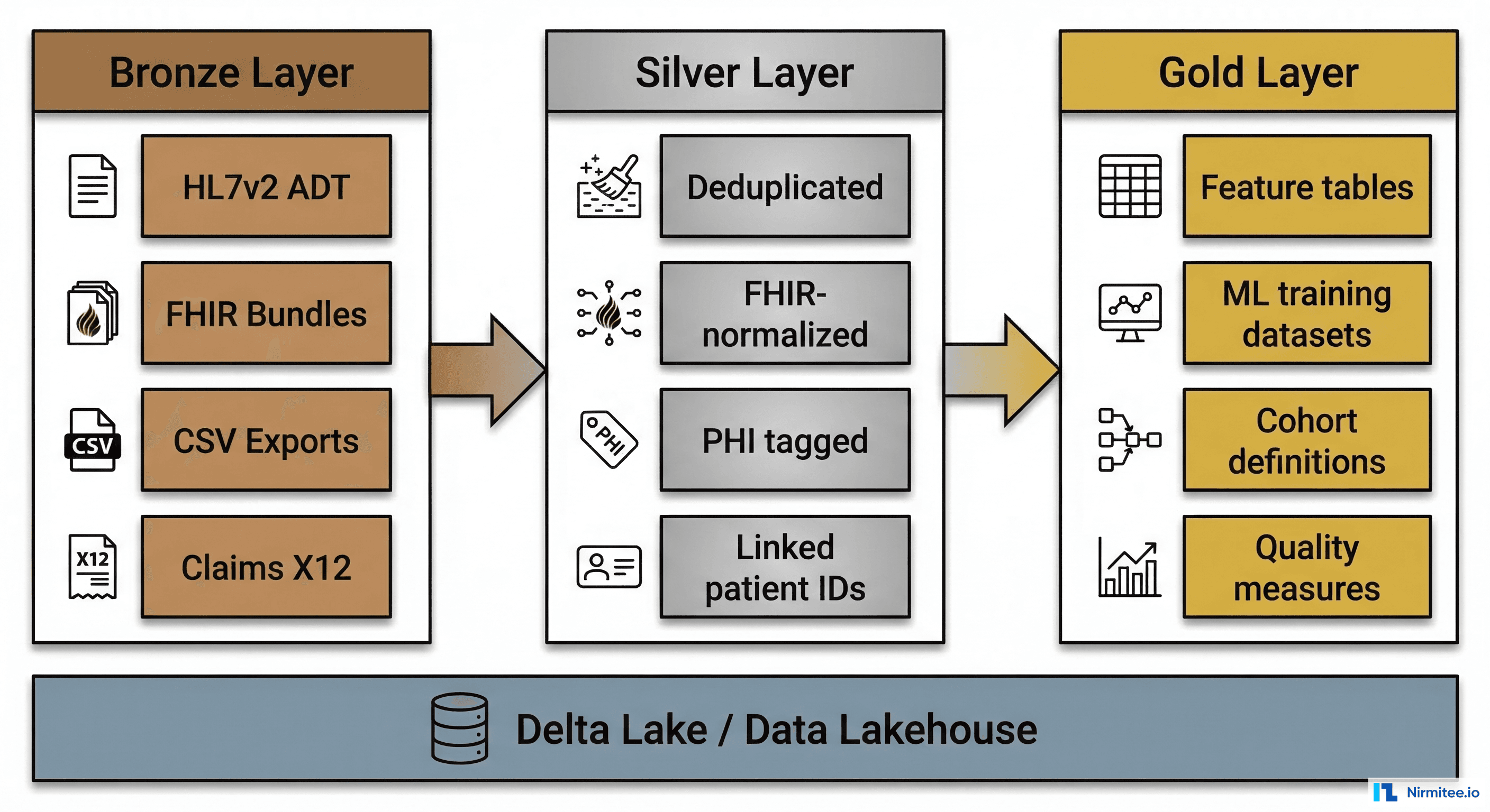 The medallion architecture (popularized by Databricks) organizes data into three progressive quality layers. For healthcare, each layer addresses specific data challenges: