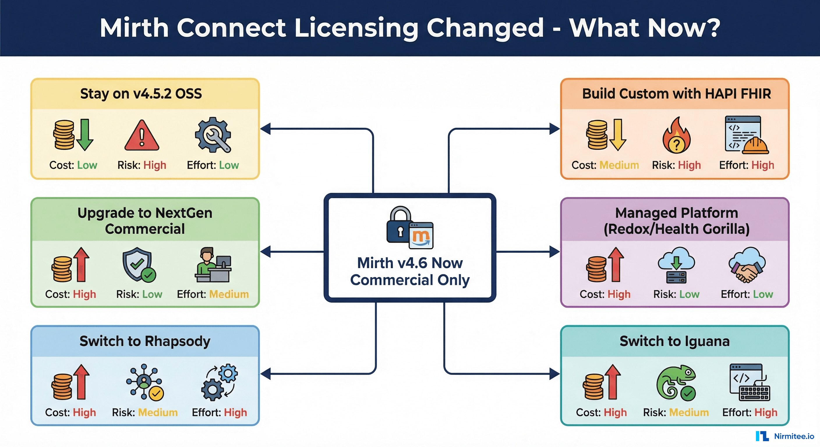 In March 2025, NextGen Healthcare made one of the most consequential decisions in the healthcare integration market: Mirth Connect version 4.6 and all future releases became commercial-only software. The last open-source version, 4.5.2, would receive no further updates, no security patches, and no bug fixes. For thousands of healthcare organizations that had built their entire integration infrastructure on Mirth's open-source foundation, this was not just a licensing change. It was a strategic inflection point that demanded a response.