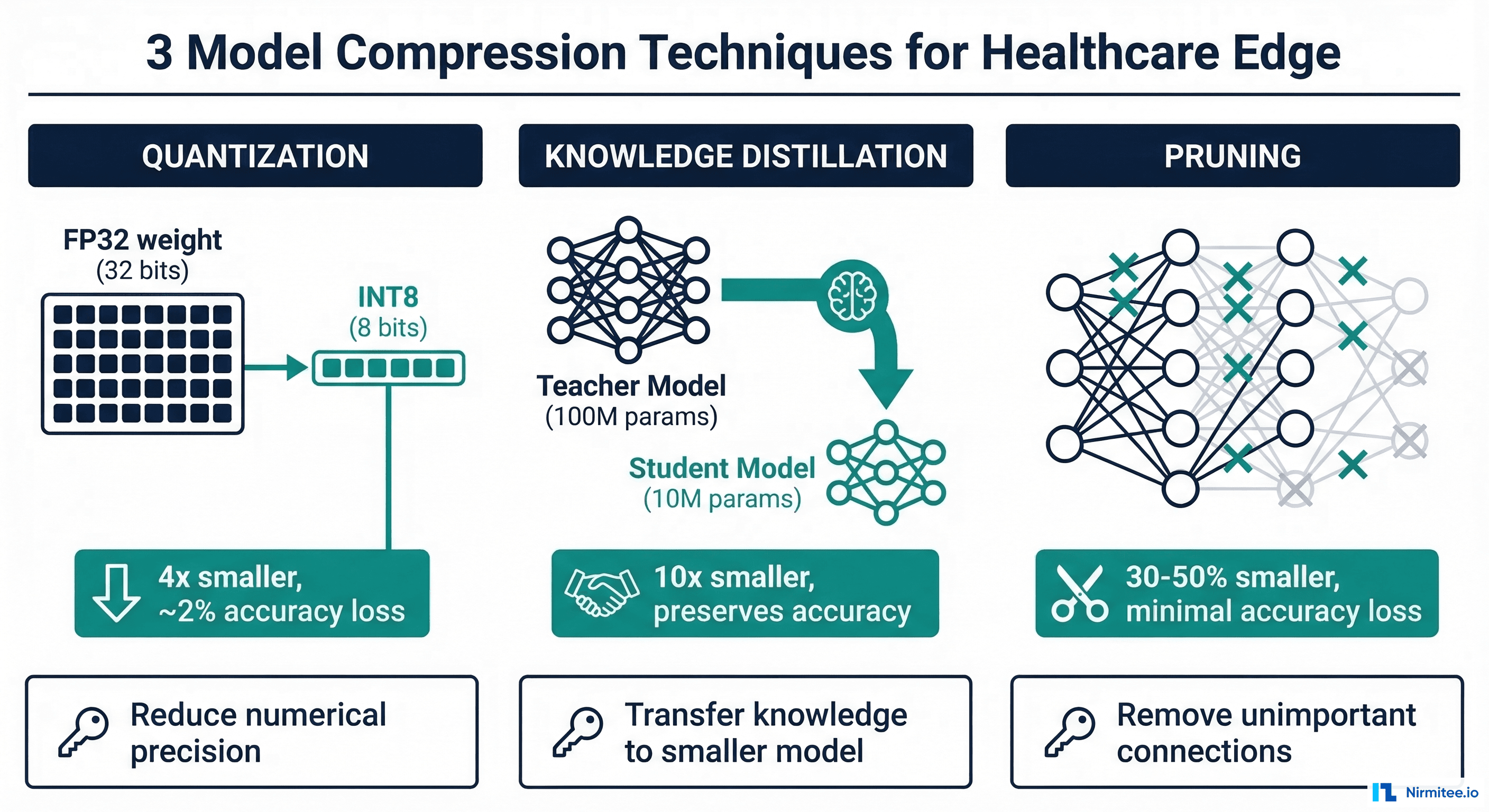 This guide covers the three primary compression techniques — quantization, knowledge distillation, and structured pruning — with healthcare-specific considerations, PyTorch implementation code, and before/after benchmark results. For deploying compressed models to specific runtimes, see our companion guide on ONNX vs TensorRT vs TFLite.
