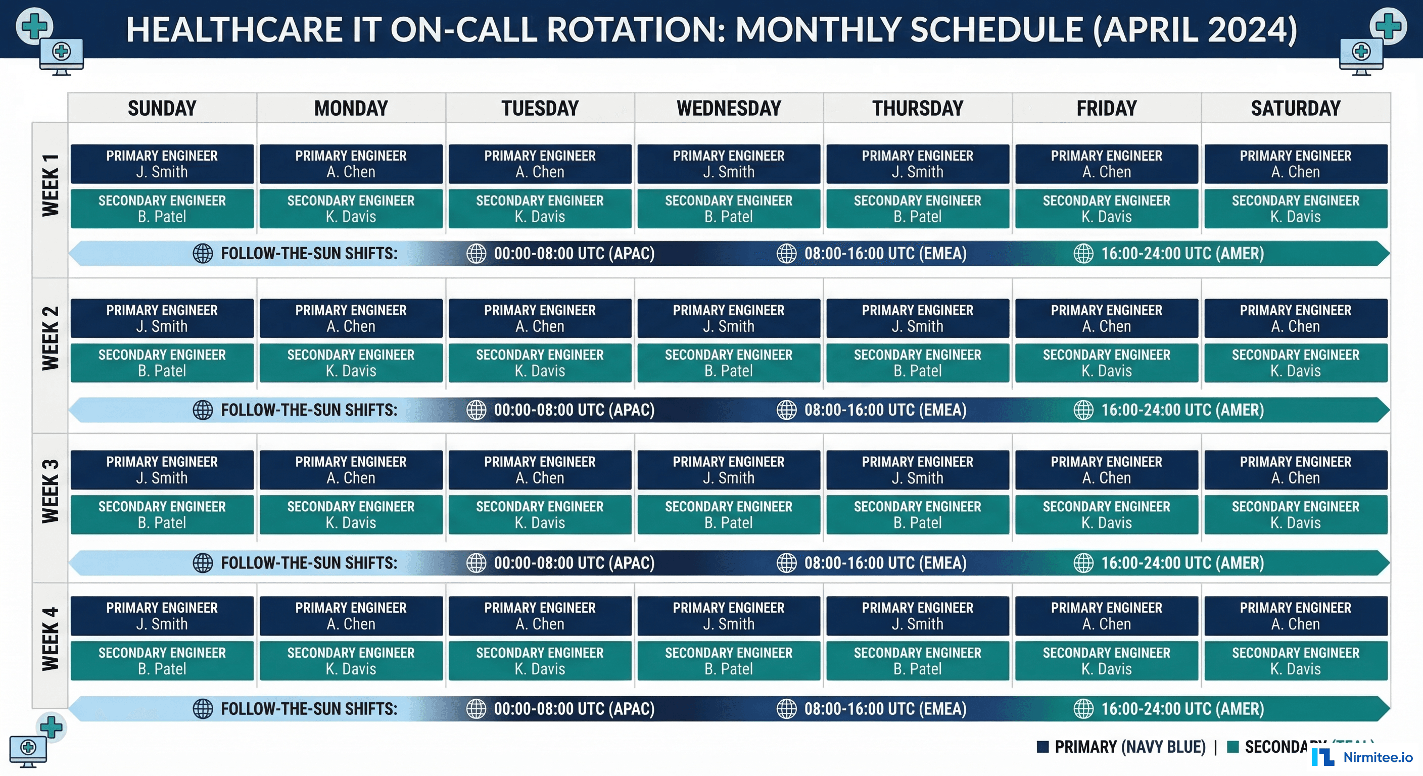 For health systems with teams across multiple timezones (or healthcare technology companies with distributed engineering), follow-the-sun eliminates overnight pages entirely: