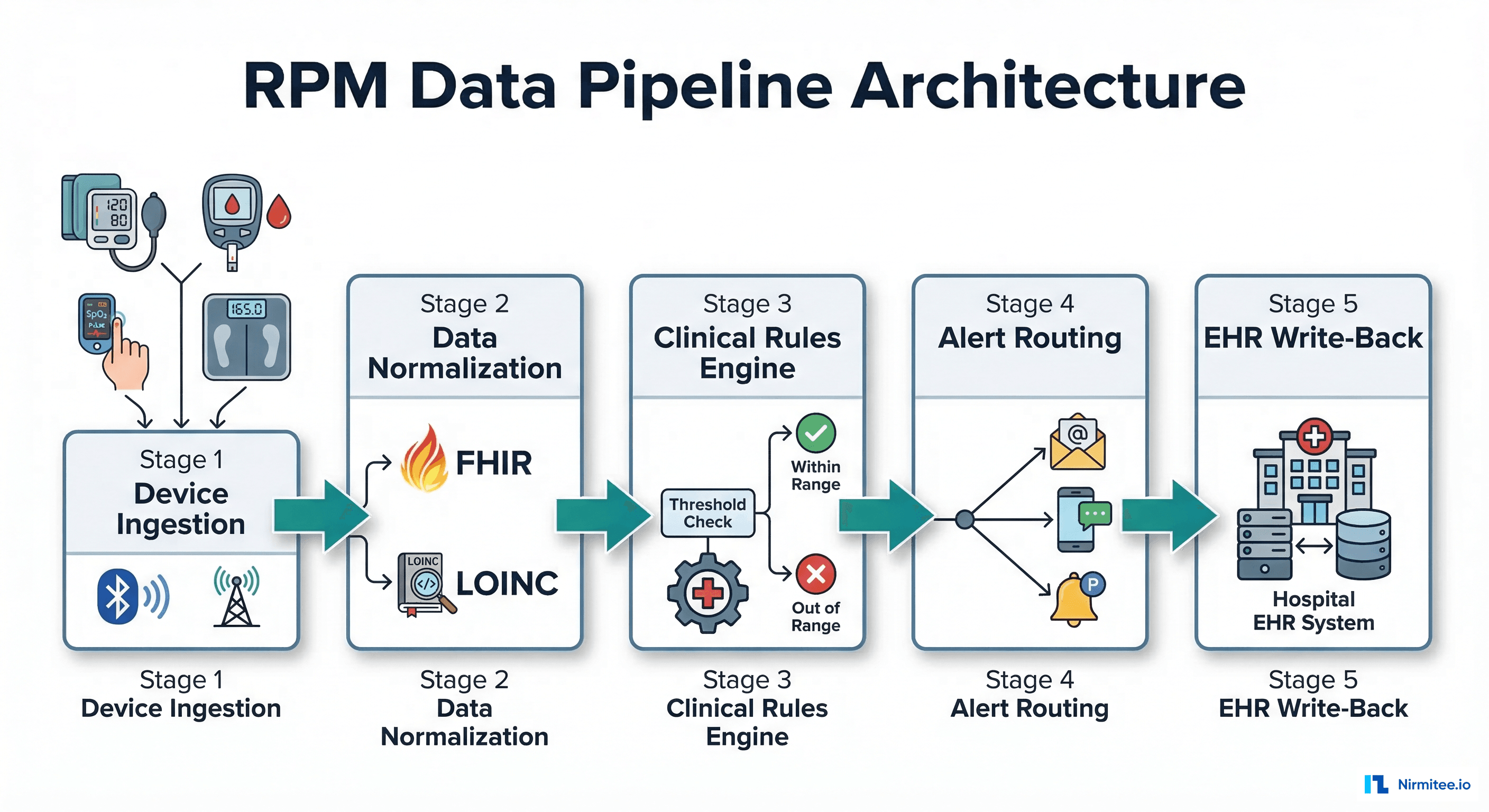 A single RPM patient with a blood pressure cuff, glucose meter, and weight scale generates 10-15 readings per day. A practice monitoring 500 patients processes 5,000-7,500 data points daily. Without a well-architected pipeline, this volume overwhelms clinical staff and creates the alert fatigue problem that undermines RPM programs. This guide covers every stage of the pipeline, from BLE data ingestion through FHIR normalization to clinical alert routing and EHR write-back.