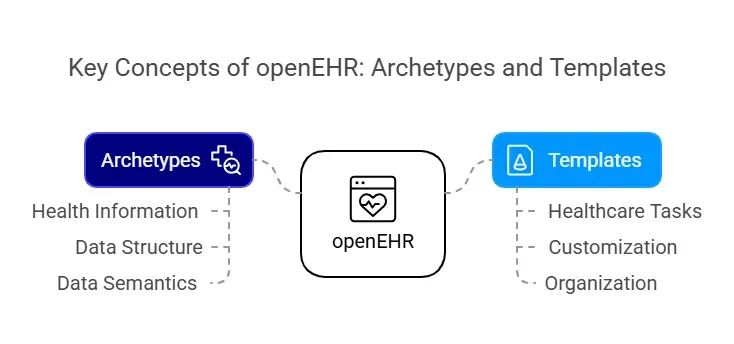 At the heart of openEHR are two main concepts: archetypes and templates. These serve as building blocks for how healthcare information is stored and shared within the system.