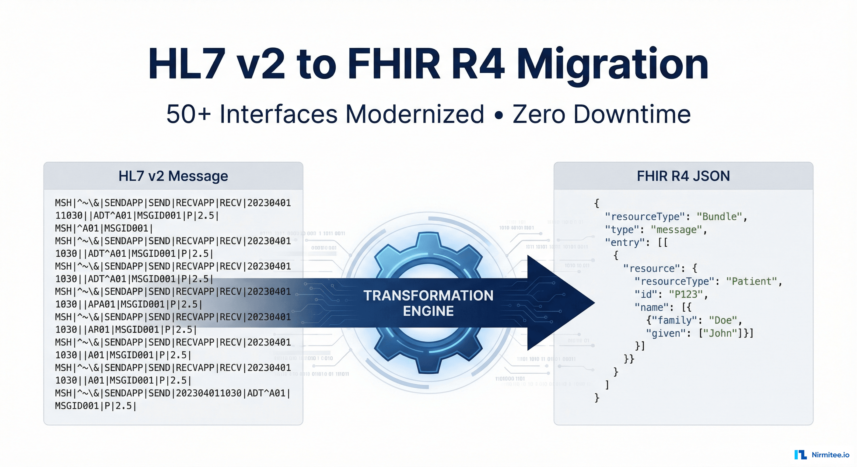 Contact Nirmitee.io to discuss your HL7 v2 to FHIR R4 migration strategy. We bring hands-on experience with Mirth Connect, HAPI FHIR, and the parallel run methodology that eliminates downtime risk.