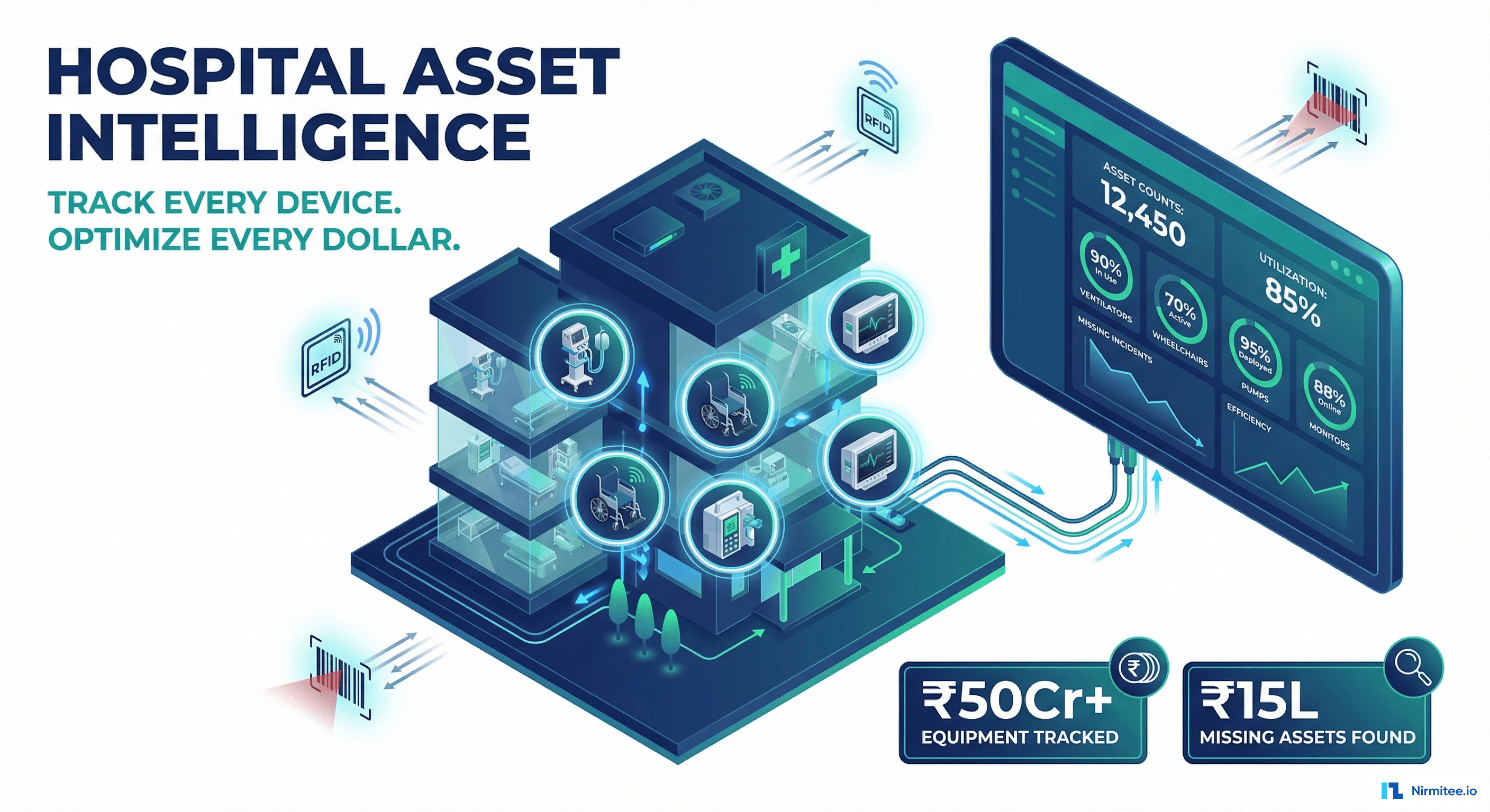 We built a comprehensive hospital asset management platform — RFID/barcode tagging for every device, real-time location tracking, a CFO financial dashboard linking assets to depreciation and ROI, predictive maintenance scheduling, and automated stock audit workflows.