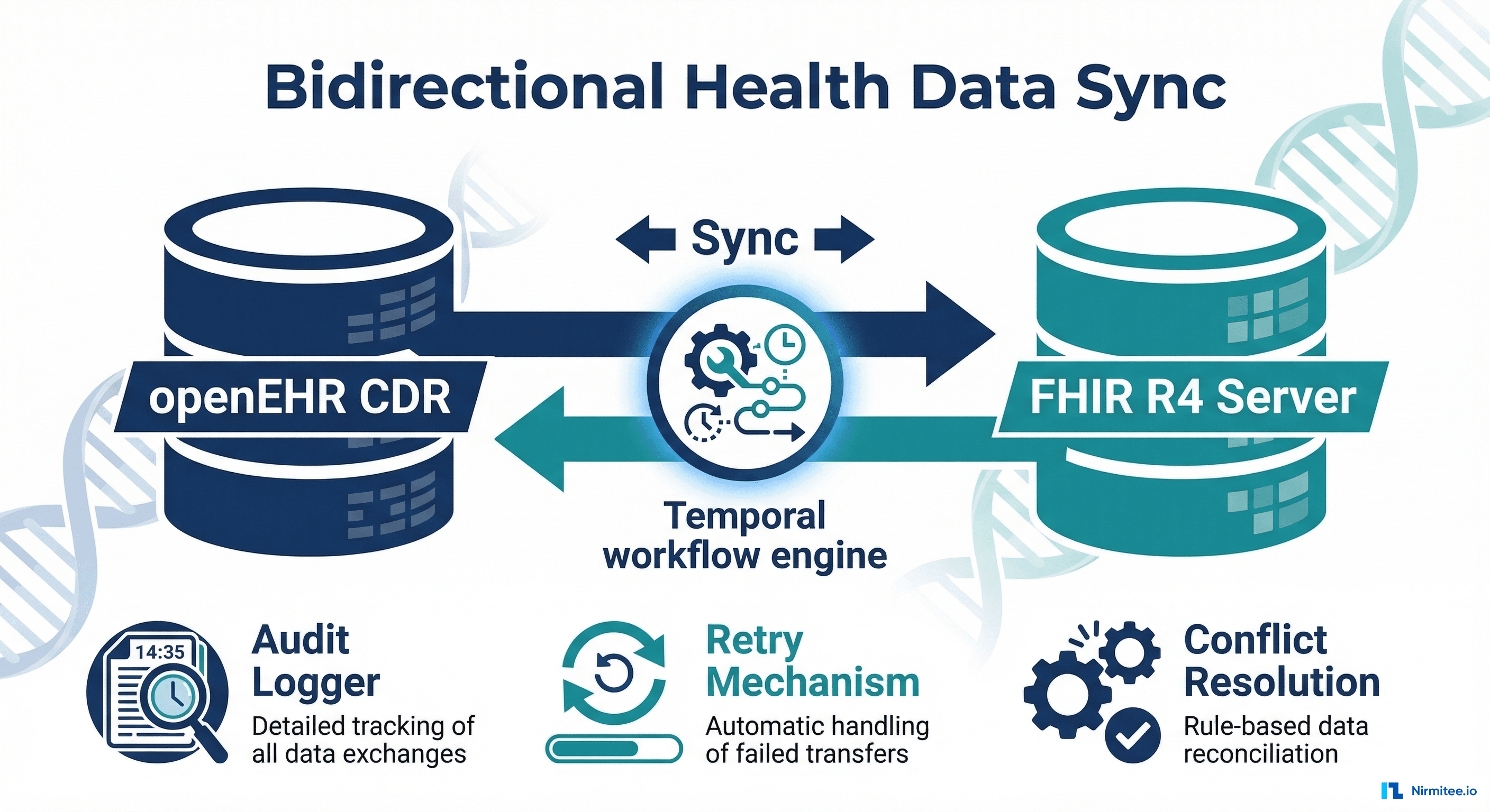 We built a Temporal-powered workflow engine that translates between openEHR archetypes and FHIR R4 resources, handles bidirectional sync with conflict resolution, and guarantees delivery through exponential backoff retries and dead-letter queuing. The result: 99.97% sync success rate with sub-2-second latency across all 5 sites.