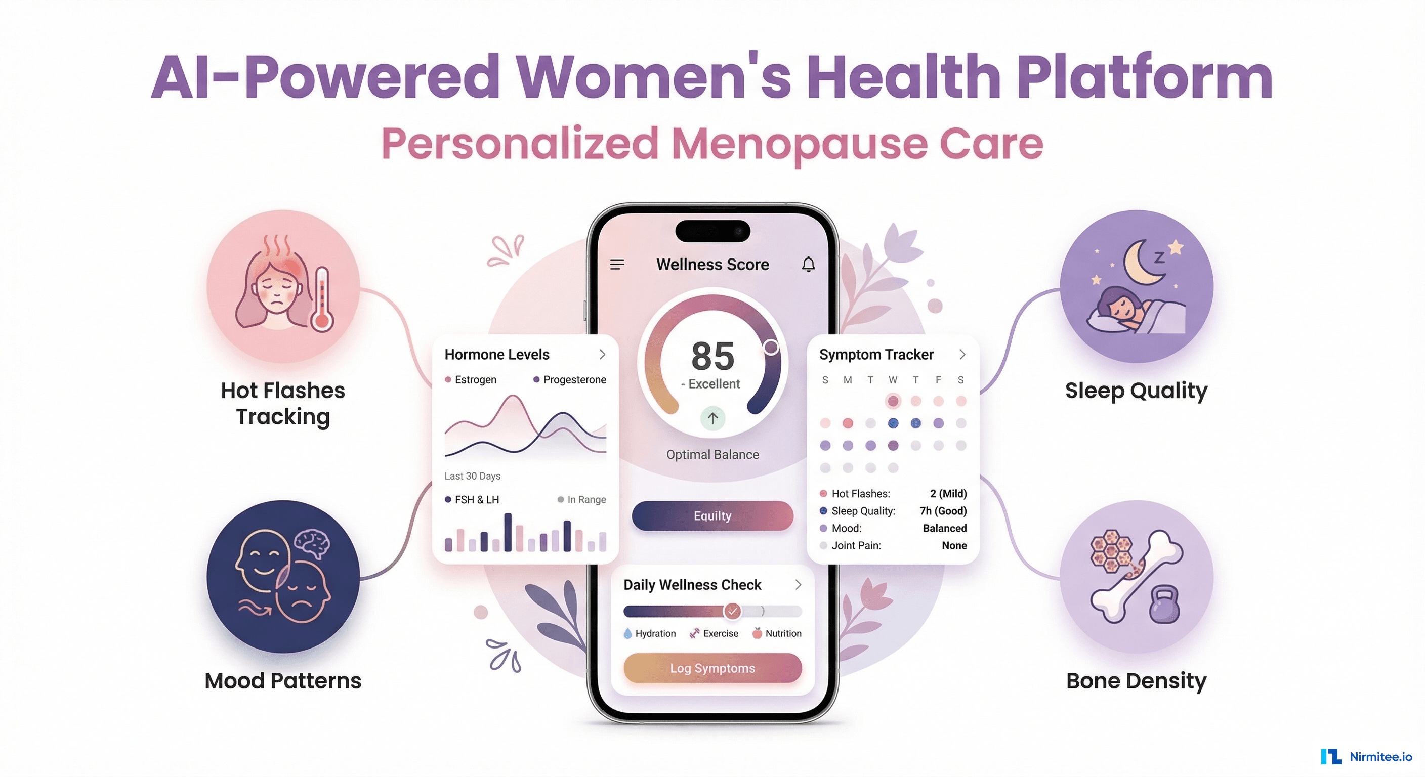 - Invisible patterns: correlations between stress, sleep, diet, exercise, and menopause symptoms exist but are invisible without continuous tracking and ML analysis.