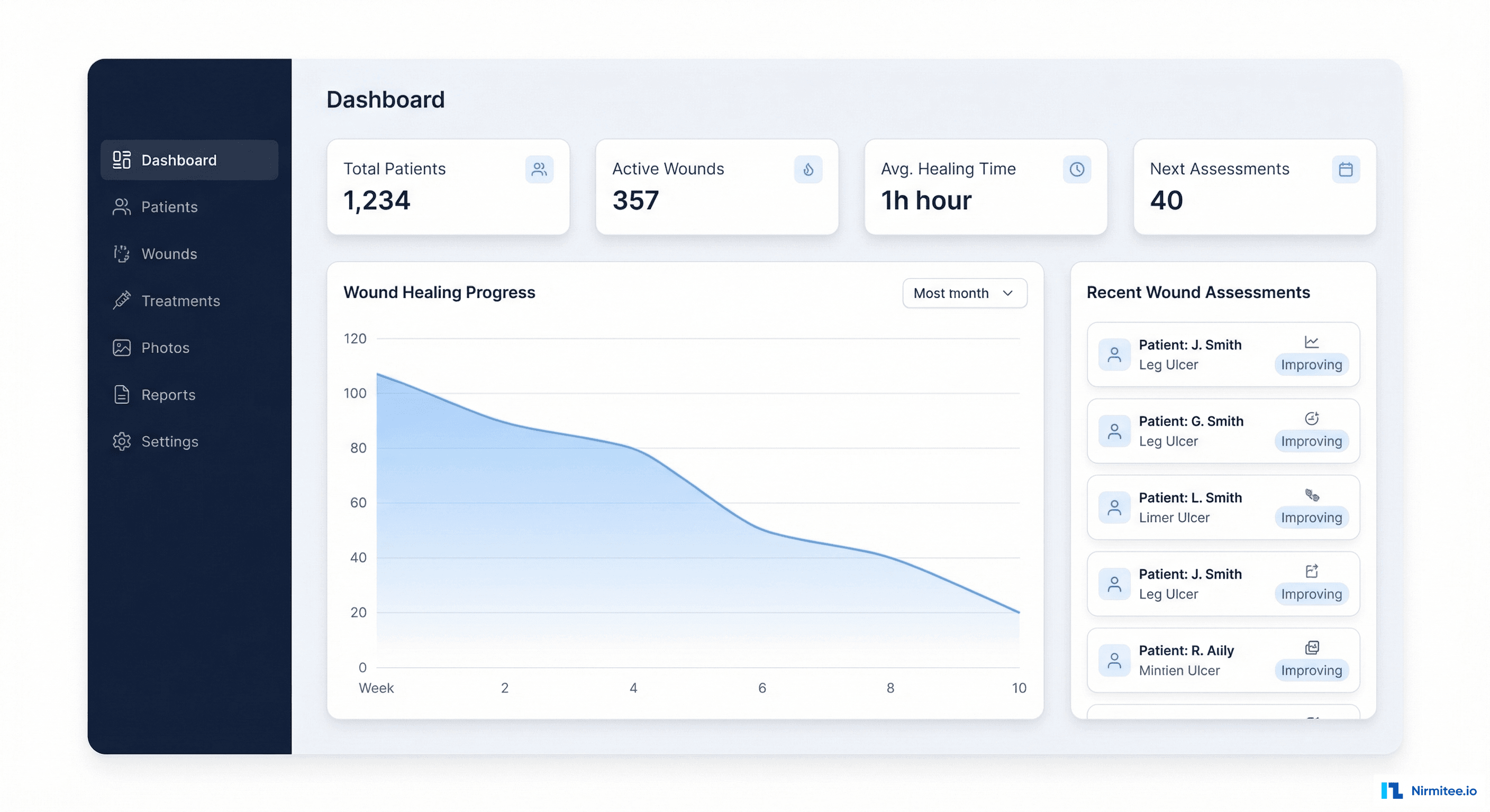 A US wound care specialty practice managing 2,400+ active wounds across 3 clinic locations had outgrown their generic EHR. Standard EHR systems treat wounds as a free-text note — no structured wound measurements, no photo management, no healing trend tracking, no wound-specific treatment protocols. The practice needed a purpose-built system.
